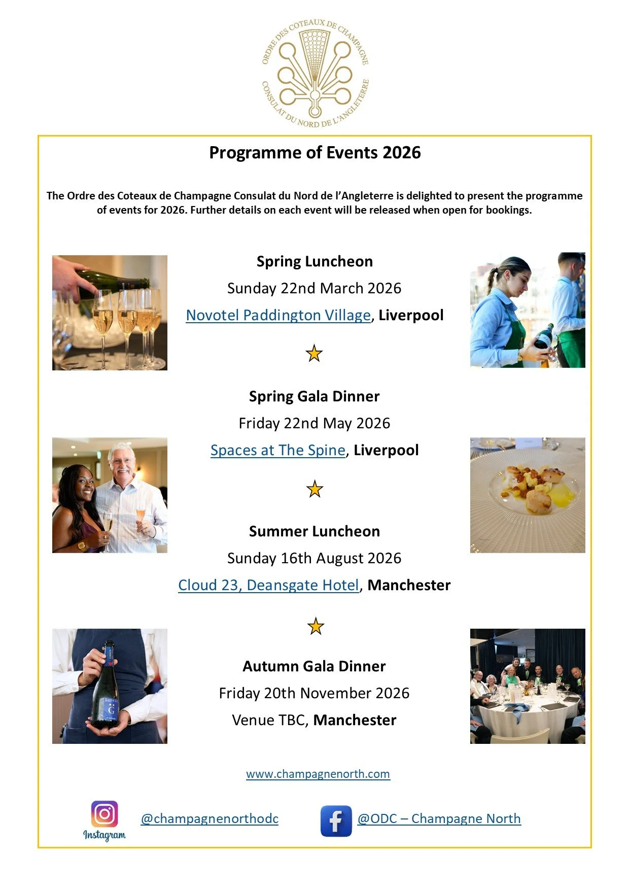 The committee of the Ordre des Coteaux de Champagne l'Angleterre du Nord is pleased to announce the programme of events for 2026. You can download our programme here.